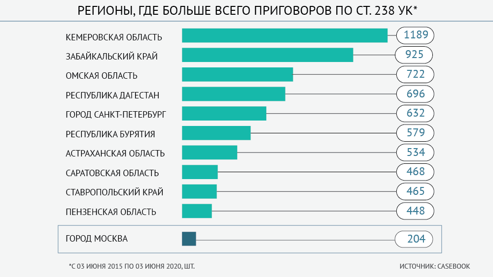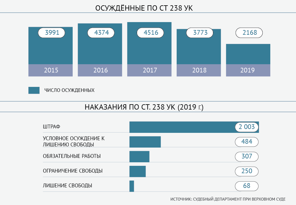 Впрочем, как показывает статистика Суддепа, число осужденных по ст. 238 УК уже два года падает. В 2019 году их оказалось в два раза меньше, чем в 2017-м (2168 против 4516). Возможно, на статистике 2019-го сказались, в том числе, разъяснения Пленума, принятые в середине года.