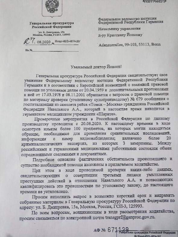 Генеральная прокуратура России направила в Министерство юстиции Германии запрос, к которому прилагаются данные доследственной проверки причин госпитализации Алексея Навального. У РБК есть копия запроса, по словам источника, близкого к ведомству, ответа на запрос Генпрокуратура пока не получила.