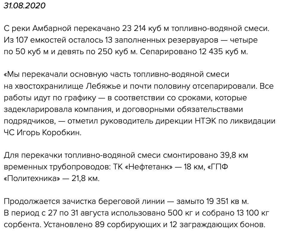 «Для нас наступает новый этап, возможно, более трудоемкий и длительный — утилизация грунта и водо-топливной смеси. Сейчас мы занимаемся перекачкой топлива к месту сепарации, рассчитываем справиться с этим в течение двух с половиной — трех месяцев», — сказал Владимир Потанин.
