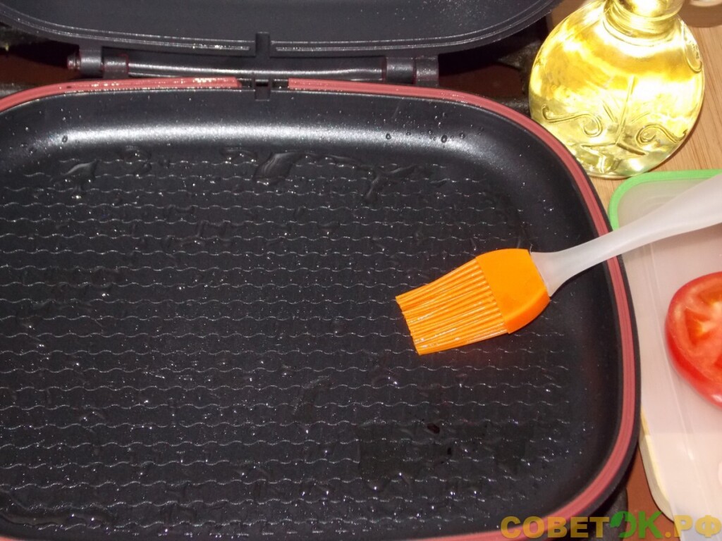 Двухстороннюю сковороду поставьте на плиту и включите под ней сильный огонь. Хорошо прогретую плоскость сковороды смажьте маслом при помощи кисточки и убавьте огонь до умеренного.