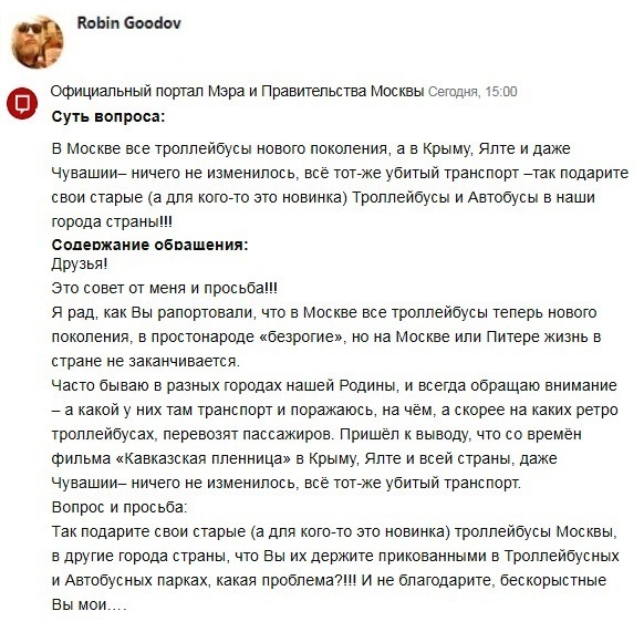 Только вчера написал письмо в Правительство, чтобы Московские и Питерские не нужные тролейбусы, подарили в другие города страны, там и старые в новинку.
