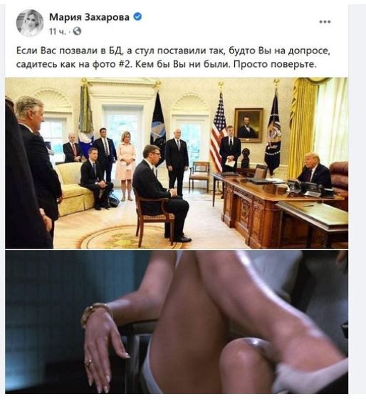 Честно сказать, меня и самого смутила верхнее фото, однако это не может являеться поводом для нанесения оскорбления и то, что сделала Захарова вообще говорит о ней как о крайне недальновидном политике, но и полагаю демонстрирует её неподобающее воспитание. Мало того, что на мой взгляд с ее стороны это оскорбление Президента Сербии, так она еще и стала давать советы как надо сидеть и просила поверить ей на слово, как будто ей все это очень хорошо знакомо и она все это уже проходила. Я так до конца и не понял причину размещения Захаровой такого поста: то ли она насмехается над Президентом и пытается его оскорбить, то ли делиться опытом говоря, что стоит поверить на слово, то ли еще по какой причине его разметила.