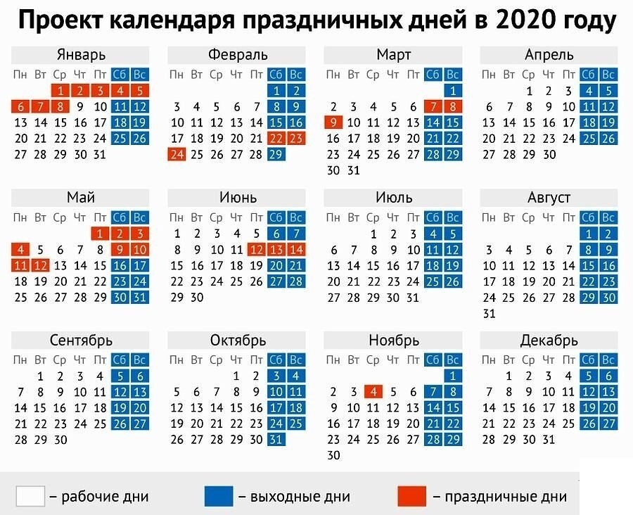 Распределение выходных в 2020 году можно посмотреть в производственном календаре.