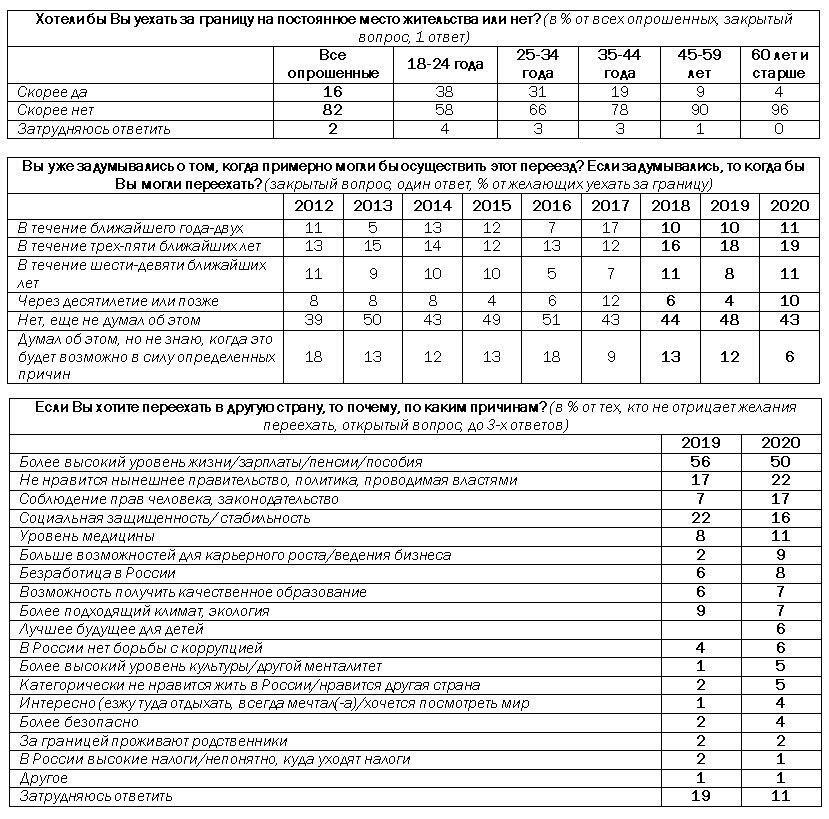 Основные причины принятия решения о переезде, по словам 16% потенциальных эмигрантов: более высокий уровень жизни/зарплат/пенсий/пособий в зарубежных странах (50%, −6 п.п. с 2019 г.); неудовлетворенность современной политикой властей (22%).