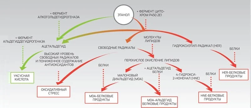 Сам этанол — мощный восстановитель, он уменьшает число окисленных НАД+, универсальных переносчиков электронов в биохимических реакциях. Это снижает окислительный потенциал клетки и приводит к замедлению синтеза глюкозы и снижению ее уровня в крови (гипогликемия), накоплению молочной кислоты и, как следствие, смещению рH в кислую сторону (ацидоз), увеличению синтеза жирных кислот и захвата жира клетками печени (обратимо только при эпизодическом потреблении алкоголя, при переходе в профессиональную лигу приводит к развитию алкогольной жировой болезни печени), а также к замедлению белкового обмена. Кроме того, этанол подавляет высвобождение гормона вазопрессина из гипофиза, в результате соли натрия, калия, глюкоза и вода проходят почечные канальцы без обратного всасывания (реабсорбции) и устремляются прямиком в мочевой пузырь. То есть алкоголь действует как не самое щадящее мочегонное, массово выводя наружу крайне необходимые для жизнедеятельности организма вещества. Сказывается и отравление основным метаболитом этанола — ацетальдегидом: он расширяет сосуды полости черепа и лица, вызывает головную боль, тошноту, рвоту, дрожь, тремор, ломоту в мышцах и суставах.