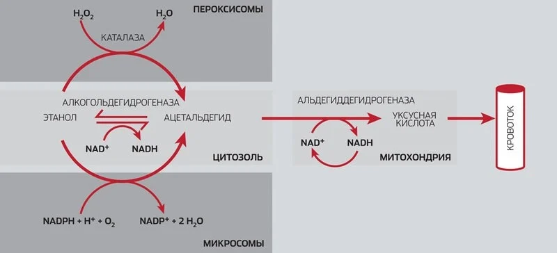 Путь этанола в организме Путь этанола в организме Активное всасывание начинается еще в ротовой полости, так что концентрация алкоголя в крови начинает нарастать сразу, быстро достигая максимума (30 минут для обычных доз, до двух часов для непривычно больших для человека количеств). Лучше всасываются сладкие, теплые и газированные напитки с содержанием этанола не более 20% (объемных процентов), особенно на голодный желудок и небольшими глотками. Утилизация этанола также начинается сразу, процесс этот ферментозависимый, протекает внутри клеток. Основной путь реализуется в гепатоцитах (клетках печени), в цитозоле которых находится алкогольдегидрогеназа (ADH). С ее помощью этиловый спирт превращается в уксусный (ацет-) альдегид. В том случае, если алкоголя поступает больше, чем может переработать эта система, включается резервная, задействующая фермент каталазу из особых клеточных органелл пероксисом (их много в нейронах головного мозга). Если и этих мощностей недостаточно, включается «микросомальное окисление», задействуется печеночный цитохром 2 Е 1. На втором этапе, превращении ацетальдегида в уксусную кислоту, задействован только один фермент, альдегиддегидрогеназа (ALDH), основное рабочее место которого — митохондрии. Затем уксусная кислота из клетки попадает в кровоток, где участвует в образовании ацетил-коэнзима А, и в таком виде уходит в цикл Кребса, распадаясь на воду и углекислый газ.