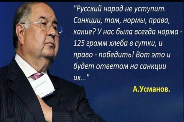 А сам Усманов пробовал прожить на 125 грамм хлеба в сутки? Сытый голодному не товарищ. Они идут на разные диеты и медицинские голодания, чтобы хоть немного сбросить жирка. Зато народу этого не надо. Кто-нибудь видел токаря или слесаря с таким лицом и фигурой, как у Усманова? Народ поджарый, но не потому, что соблюдает диету, а потому, что есть стал значительно меньше по причине отсутствия денег. Усманову подобное не грозит. Зажравшаяся свинья, которая еще пытается чему-то учить народ. Лучше бы поделился с народом наворованными у него же деньгами.