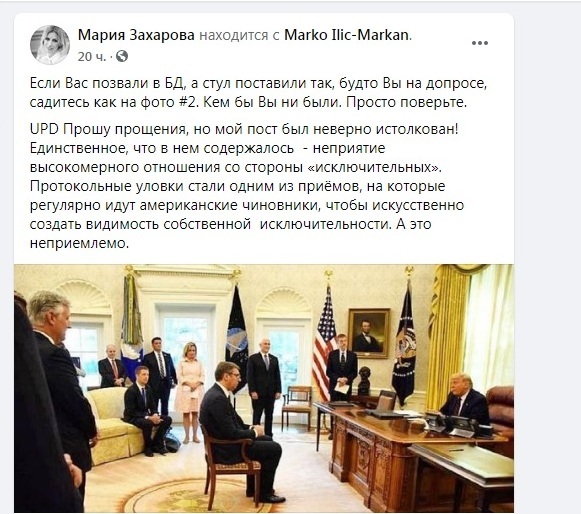 Ну и дальше: взаимное признание дипломов, поддержание религиозной свободы, обеспечение безопасности в аэропортах для будущего безвизового режима с США. А в Белграде откроется представительство U.S. International Development Finance Corporation, которое намерено финансировать местные и региональные проекты. Ну и ещё сербский президент похвастал, что пункт о взаимном признании Сербии и Косово исключён из соглашения. То есть вот всё это подписание между теми, кто друг друга не признаёт? И президент, дружественный России, практически этим отдаёт страну под контроль США - это как? Ну да, США же не наш стратегический противник, а наш "западный партнёр"! А у Марии Захаровой просто вырвалось. На фото то всё правильно и президента Вучича такое положение вполне устраивает. И российский МИД тоже устраивает, как и российского президента. А у Марии Захаровой просто вырвалось. И в октябре в Сербии ждут приезд российского президента Путина.