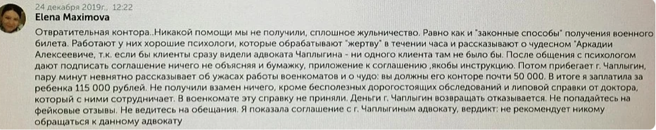 Сегодня речь пойдет о большой сети юридических фирм, которые "помогут" вам с большой финансовой радостью не пойти в армию. Да, да на сайте "Призыва-нет", вам с удовольствием расскажут, как хорошо вам будет дома, пока ваши ровесники будут отдуваться в армии. И что первая консультация бесплатная, предоставляется рассрочка и вам "обязательно" вернут деньги, если что-то пойдет не так (любой каприз за ваши деньги). А оно обязательно пойдет, ведь под это дело можно любой случай подставить и тогда возврата денег не будет, это описано в договоре. Некоторым призывникам "везёт", им дают такую категорию с которой потом, разве что на стройке будут ждать и то в качестве, принеси-подай. Ну да, стоишь ты такой в наряде и кропишь на клочке бумаги, жалобу на горе-компанию. Правда, нужно отметить, что врачи там действительно есть и они достаточно компетентны в вопросе психологии, чтобы где нужно "надавить" на молодого бойца, на случай, если тот решит соскочить и такая забота оценивается примерно в сотню тысяч рублей.