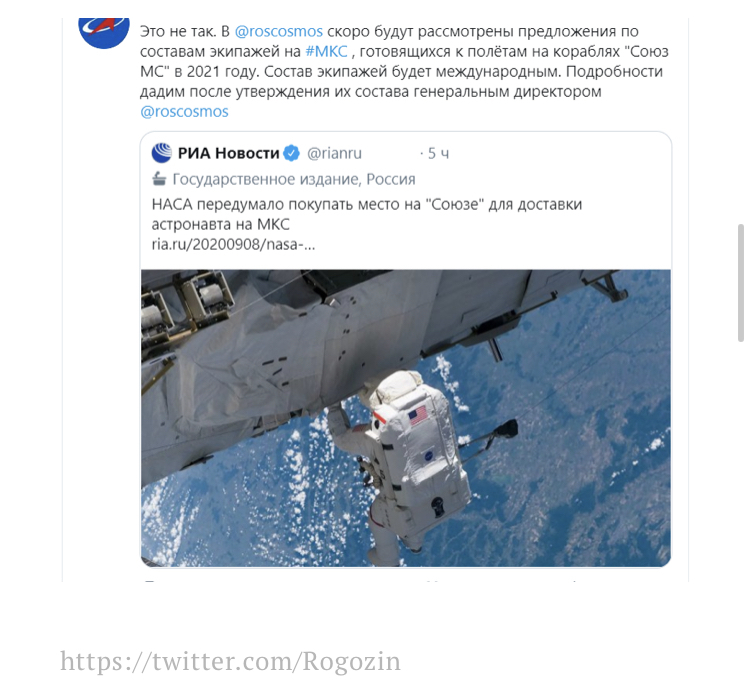 «Это не так. Скоро будут рассмотрены предложения по составам экипажей на МКС, готовящихся к полётам на кораблях «Союз МС» в 2021 году. Состав экипажей будет международным. Подробности дадим после утверждения их состава генеральным директором», — написали в Роскосмосе.