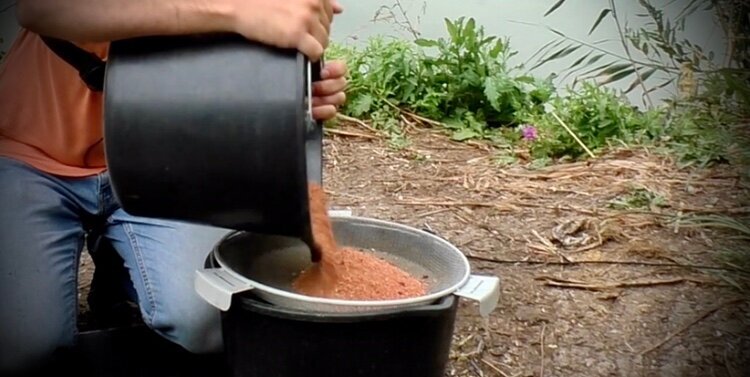 фракция осталась в сито, а в ведре здесь у меня теперь однородная мелкая смесь.