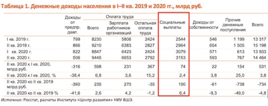 Эксперты «Центра развития» ВШЭ подсчитали, что только выплаты на детей должны были оставить на руках у россиян около 270 млрд рублей, однако в данных Росстата по структуре денежных доходов населения этих сумм не наблюдается, так как согласно официальной статистике, за II квартал 2020 года граждане России получили только 74 млрд рублей дополнительных социальных выплат (на 2,4% больше чем в I квартале 2020 года).