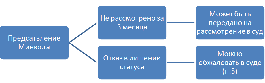 После внесения представления у адвокатской палаты будет 3 месяца для принятия решения. В случае отказа в лишении статуса, либо нерассмотрения представления Минюст может обратиться в суд.