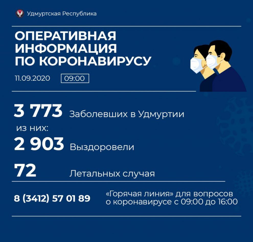 Всего на 11 сентября в Удмуртии зарегистрировано 3 773 лабораторно подтвержденных случая коронавирусной инфекции. 2 903 человека выздоровели. 72 летальных случая. Состояние заболевших: 595 в удовлетворительном состоянии, 165 средней степени тяжести, 38 в тяжелом состоянии.