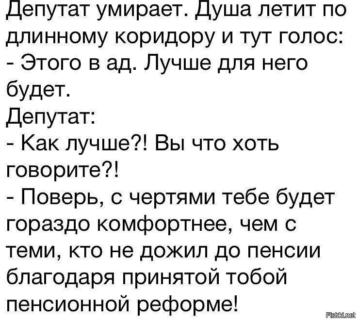 Прибыл депутат в ад и видит: раскалённая пустыня, пекло, в котлах его друзья и знакомые варятся… Депутат оторопел, и тут подходит к нему чёрт. Депутат спрашивает: «А где прекрасная жизнь, гольф, деликатесы?»