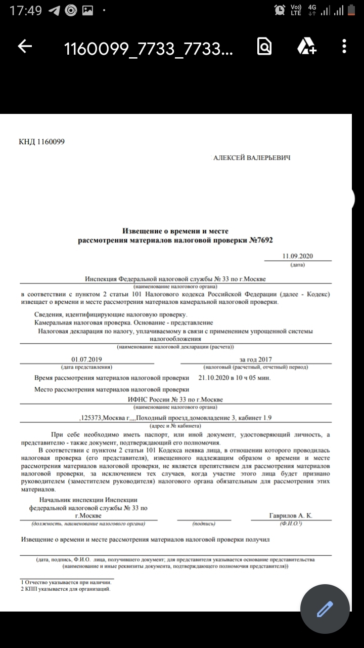 11.09.2020 пришло извещение о дате и месте рассмльрение материалов по камеральной проверки. Основанием является налоговая декларация, поданная в июле 2019 года за 2017 год. В 2018 году декларацию не подавал, а просто оплатил предполагаемую сумму налогово с запасом. В 2019 подал декларацию за 2018 и оплатил, а за 2017 просто подал декларацию. За одно провел сверку, чтобы убедиться, что ко мне претензий нет.