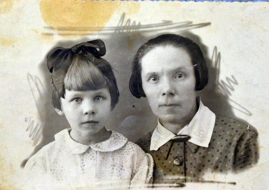 На снимке моя бабуля Колобова Агния погибшая под обстрелами на Мойке в блокадном Ленинграде и моя мамуля Крючкова Нелли. В блокаду вместе с бабулей вышивали знамена золотой нитью, после за это была награждена медалью "За доблестный труд" в 1941-1945 г. г.