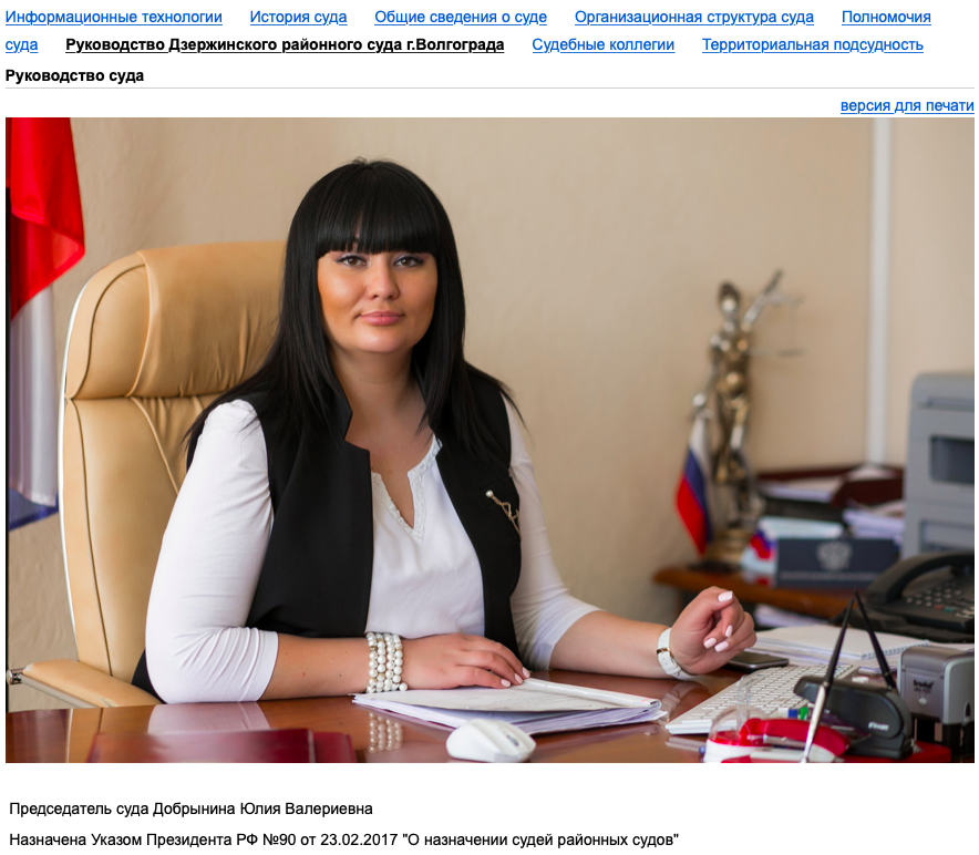 Но тогда было опровержение, и на сайте Дзержинского районного суда Волгограда продолжало красоваться фото федерального судьи Юлии Добрыниной.