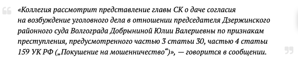 Сейчас же Высшая квалификационная коллегия судей РФ 23 сентября рассмотрит просьбу главы СК Александра Бастрыкина о привлечении к уголовной ответственности судьи Юлии Добрыниной, которую обвиняют в мошенничестве.