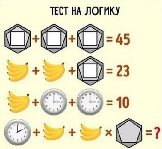 Валерий Львович,67 будет правильно, если бы бананов везде было бы по 4,а часы оценивались бы не по времени, то они равнялись бы 3,а шестиугольник в последнем равенстве не потерял бы внутри квадрата. Короче в мое время, не было таких математических примеров, поэтому у меня тоже ответ равнялся 67.Этот пример чем-то напоминает современные кредитные договора.
