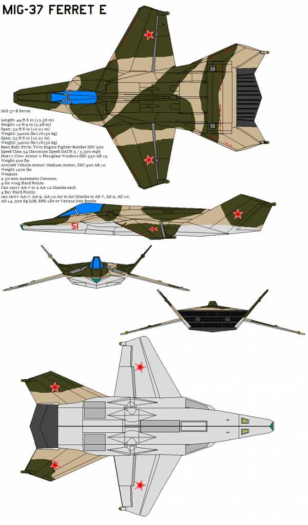 Некоторые источники утверждают, что первый полет МиГ-37 был проведен в 1988 году, в НАТО даже присвоили ему имя Ferret, которое очень близко по значению к Stealth. Почему самолет получил название именно 37? Ведь последний был МиГ-31. Скорее всего, 33 и 35 резервировались под проекты легкого и тяжелого многоцелевых истребителей. Тяжелый истребитель в западной прессе стали называть МиГ-39, у нас он более известен как МФИ. 33-й нынче называют МиГ-29 М. Иностранная пресса также говорит о существовании триплана, созданного на базе Су-37 и МиГ-29, но это неподтвержденная информация.