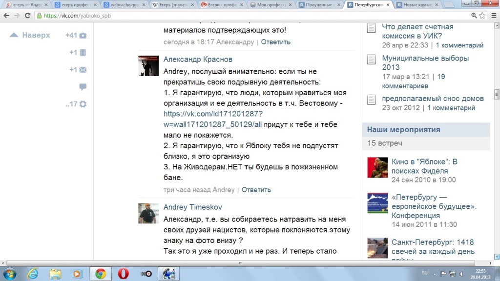 Однажды, один из них - активист "Яблока" (!), в очередной угрозе упомянул НИК "Вестовой" , который входил в число сподвижников Тесака - Марцинкевича (см. скриншот)