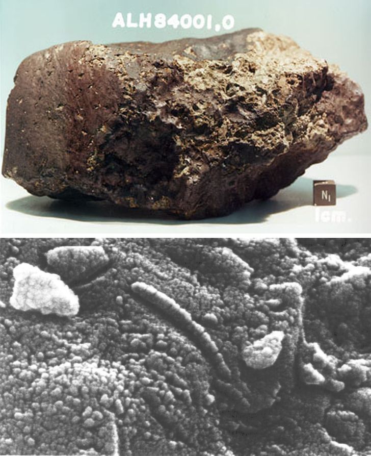 Марсианский метеорит, который мы знаем под названием Allan Hills 84001, был найден в горах Алан Хиллс в Антарктиде 27 декабря 1984 года. Эта находка вызвала широкий общественный резонанс из-за того, что на поверхности метеорита были найдены окаменелые микроскопические структуры, которые могли быть бактериями. Вопрос о внеземном происхождении бактерий до сих пор открыт, но в его пользу говорит тот факт, что размер найденных структур — 20–100 нанометров в диаметре, что гораздо меньше любой известной нам формы клеточной жизни.