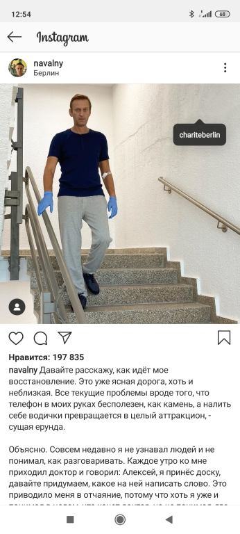 Блогер сообщил на своей странице в Инстаграмм https****.com%2Fp%2FCFUAPu8llSO%2F%3Figshid%3D8gy41l2idjj">://www.instagram****.com/p/CFUAPu8llSO/?igshid=8gy41l2idjj, что у него дрожат ноги, но он все же может идти по лестнице, а совсем недавно, по его словам, он даже не узнавал людей и не понимал, как разговаривать. Каждое утро к нему приходил доктор с доской и предлагал подумать над тем, какое написать слово, а Навальный был в отчаяние, потому что хоть и понимал в целом, что хочет доктор, но «не понимал, где брать слова».