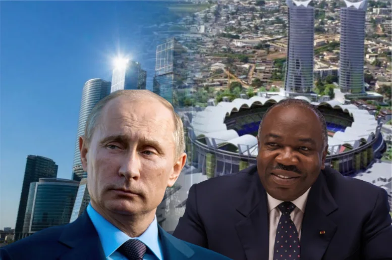 Путин на фоне Москва Сити и президент Габона на фоне столицы Либревиль