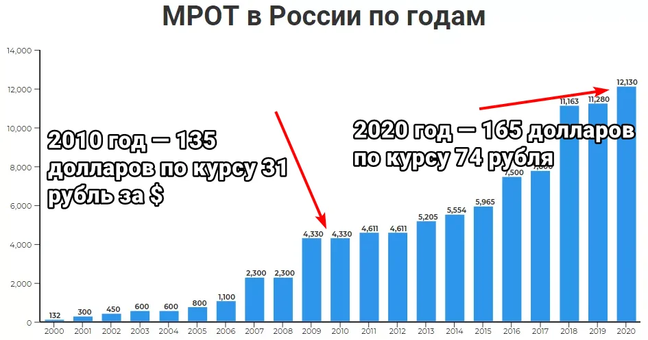 Принято всё считать в долларах, так как рост в нём более заметен. В 2010 году минимальный размер оплаты труда в России составлял 4330 рублей. Если перевести эту незначительную сумму в доллары по курсу 31 рубль за доллар, то получим внушительные 135$. Как думаете, это достаточный уровень зарплаты для выживания? Думаю, что нет. А теперь представьте, что за 10 лет курс вырос в два раза, а МРОТ остался практически на том же уровне. Теперь МРОТ в России составляет 12130 рублей. А в долларах это 165.