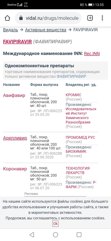 Действующее вещество – фавипиравир – было изобретено в Японии в 2002 году (18 лет назад!) как средство от гриппа типа А и В, одобрено правительством Японии в 2014 году. Такой большой срок от изобретения до одобрения потребовался для решения вопроса побочных эффектов, которые вызывал препарат в 2002 году. Стоимость японского фавипиравира составляет около $135. В РФ японский фавипиравир стоит от 13 000 до 20 000 рублей за упаковку.