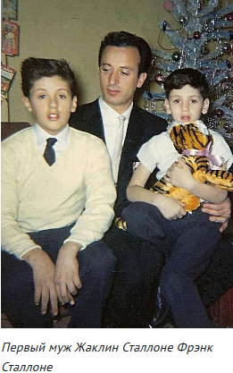 Первым муж. Фрэнк Сталлоне (1919—2011). Со своим первым мужем, Фрэнком Сталлоне (1919—2011), иммигрантом из Сицилии, Джеки прожила в браке 12 лет с 1945—1957 годы. Фрэнк Сталлоне владел небольшой сетью парикмахерских. Старшего Сталлоне отличал скверный и сварливый нрав, он прослыл бабником, любил выпить и переодически поднимал руку на жену. В этом браке она родила двоих сыновей Сильвестра и Фрэнка, на которых муж совершенно не обращал внимания.