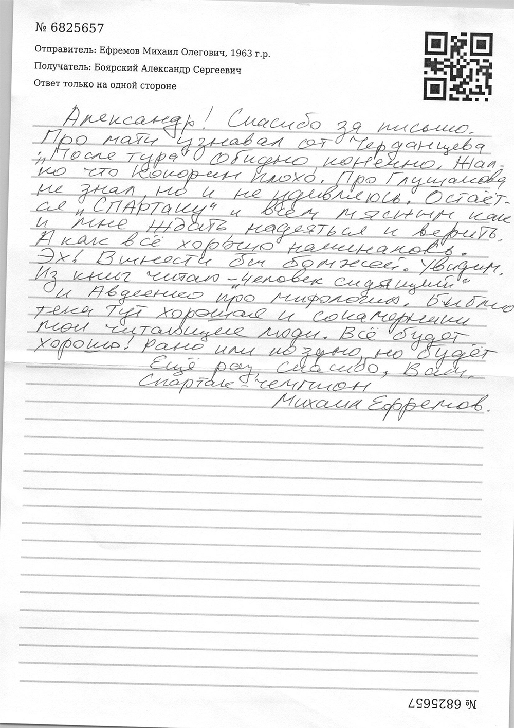 Известно, что Михаил Ефремов является страстным поклонником футбола и болельщиком «Спартака». Письмо с подробностями игры было направлено вскоре после матча ЦСКА — «Спартак», в котором его любимый клуб уступил 1:3.