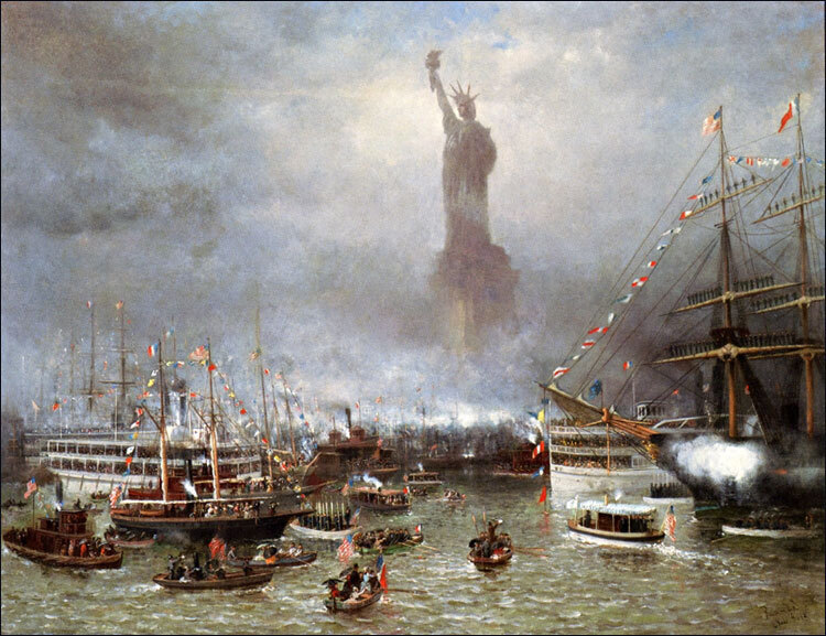 17 июня 1885 года в Нью-Йорк была доставлена разобранная Статуя Свободы. Пароход, который доставил Статую домой встречали тысячи счастливых лиц. 28 октября 1886 года была проведена церемония открытия Статуи Свободы. Празднование началось с парада, прошедшего по улицам Манхэттена, причем из окон Нью-Йоркской биржи на процессию бросали импровизированный серпантин — ленты телеграфных аппаратов, печатавших биржевые котировки (именно тогда в Нью-Йорке возникла традиция «парадов телеграфных лент»). Затем официальные лица во главе с Президентом США Гровером Кливлендом переместились на остров Бедлоу, где, после произнесения торжественных речей, с головы статуи был снят закрывавший ее французский флаг.
