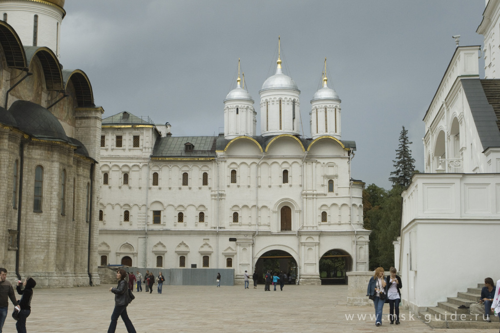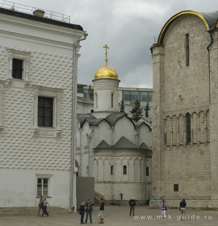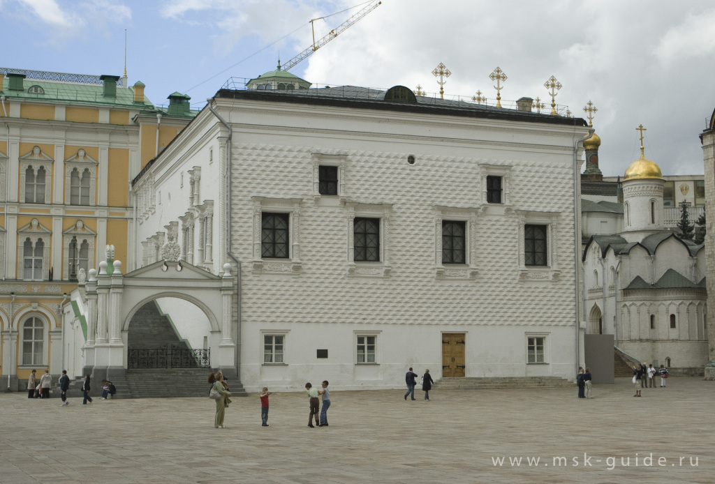 В 1487–1491 годах для торжественных приемов строится Грановитая палата. Она была задумана как тронный зал в новом дворце Ивана III и два века оставалась самым большим залом — 495 кв.м. Строительство велось итальянским мастером Марко Фрязиным, а затем — ломбардским архитектором Пьетро Антонио. Парадные Святые сени примыкают с западной стороны здания. К ним ведет открытая каменная лестница — Красное крыльцо. Главный восточный фасад, облицованный белокаменными блоками, выходит на Соборную площадь. Каждый из блоков отесан на четыре грани. Отсюда и название Палаты — Грановитая. В 1838–1849 годах при строительстве Большого Кремлевского дворца ее через Святые сени соединили с Владимирским залом. Сейчас Грановитая палата является одним из представительских залов при Резиденции Президента Российской Федерации.