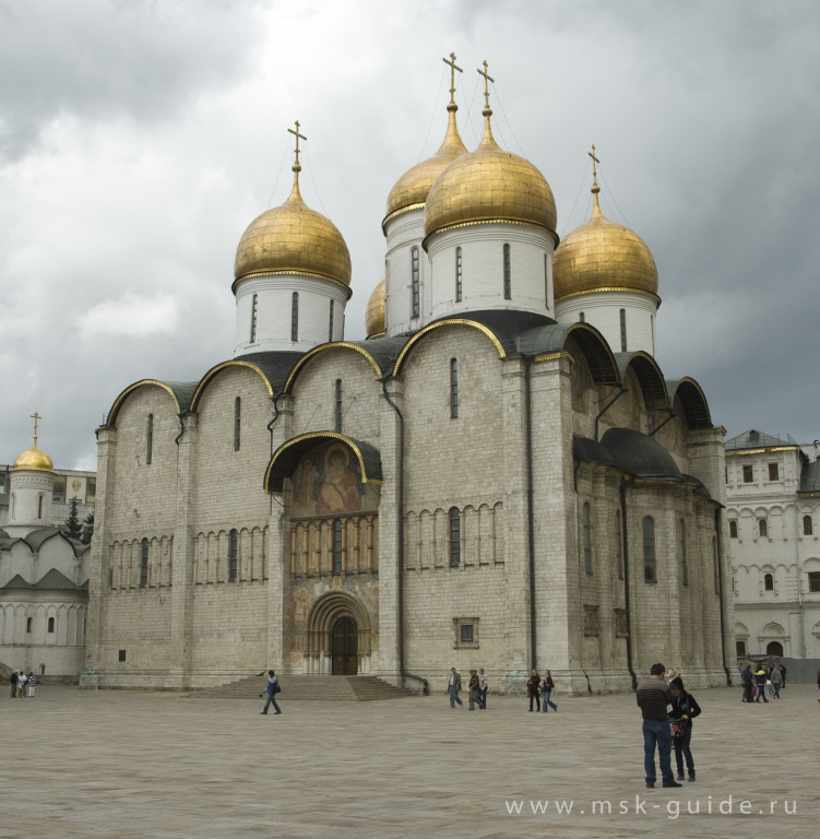 Древнейший памятник Кремля — Успенский собор. Все остальные постройки здесь появились позднее. И когда их строили, ориентировались на Успенский собор, расположенный в глубине площади. Еще со времен основания города здесь стоял деревянный храм Успения Богородицы. Затем в 13 веке на его месте был построен каменный собор. В 1326–1327 годах при великом князе Иване Калите был возведен новый каменный собор. Под руководством итальянского зодчего Аристотеля Фиораванти был построен новый храм, освященный 12 августа 1479 года. Успенский собор на протяжении четырёхсот лет оставался главным храмом Государства Российского. Собор имеет четыре престола: главный освящен в честь Успения Богородицы, другие — в честь великомученика Димитрия Солунского, Похвалы Богородицы и апостолов Петра и Павла. Здесь находилась чудотворная Владимирская икона Божией Матери. Сейчас она выставляется в Третьяковской галерее. Одна из реликвий, сохранившихся до наших дней — Гвоздь Господень, одно из орудий казни Иисуса Христа. В соборе находятся 19 гробниц: десяти митрополитов и девяти патриархов.