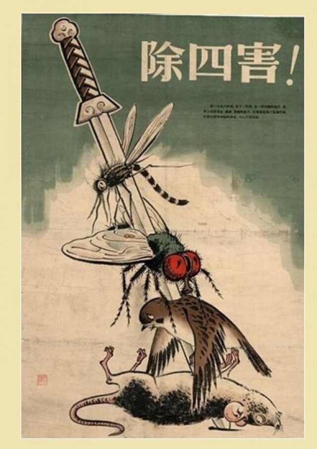 Получаемый в кустарных условиях металл являлся чугуном самого низкого качества и за редким исключением был непригоден для использования в промышленности. Сами люди называли свои изделия — «нюши гэда», что означает коровьи лепешки. В стране началась чувствоваться нехватка продовольствия, но, вместо того, чтобы признать свою ошибку и вернуть крестьян на землю, Мао начал экспериментировать с посевами, приказав засеивать поля в 5 раз гуще, а семена закапывать в 2 раза глубже. Этот метод, некогда предложенный советским псевдоученым Лысенко, почти полностью погубил урожай. И опять никто не стал учиться на ошибках. Были найдены виновники бед китайского народа, в число которых попали мухи, комары, воробьи и крысы. Воробьи, посягающие на урожаи, были объявлены проблемой номер один и их партия решила искоренить полностью.