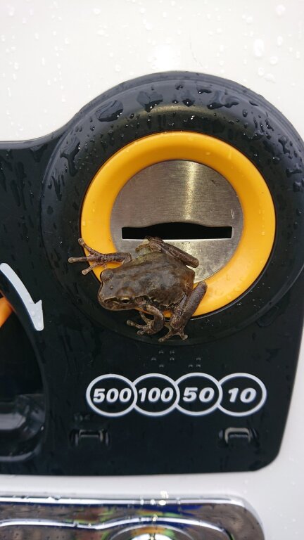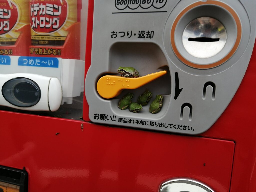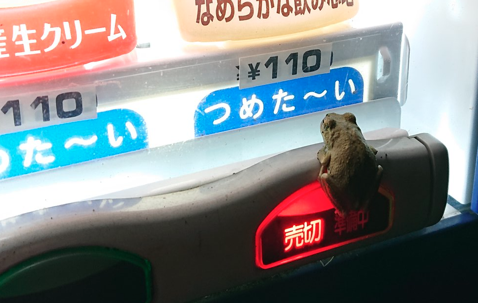Как объяснило издание SoraNews, в Японии часто можно обнаружить маленьких лягушек возле вендинговых автоматов. Обычно они забираются на рычаг для выдачи сдачи, но эта лягушка почему-то забралась прямо в монетоприемник.
