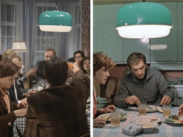 Эта зеленая люстра тоже успела засветиться на экранах в прямом и переносном смысле. Сначала она появилась в квартире Басилашвили в “Служебном романе”, а затем перекочевала в ленту Владимира Меньшова к героине Вере Алентовой. И это не удивительно, ведь в то время во многих домах можно было заметить типовые люстры, скатерти и прочие вещи.