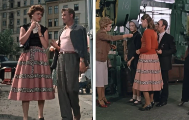 Впервые эту симпатичную розовую юбку можно было заметить в ленте “Девушка без адреса”. Ее примерила женщина по имени Клава, которая была безответно влюблена в главного героя. А второй раз юбка появилась в мелодраме “Москва слезам не верит”. Она была на телеведущей, которая пришла брать интервью у главной героини.