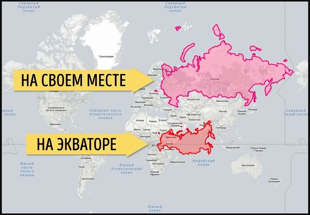 Так, Россия на уровне экватора имела бы на карте существенно меньшие размеры: