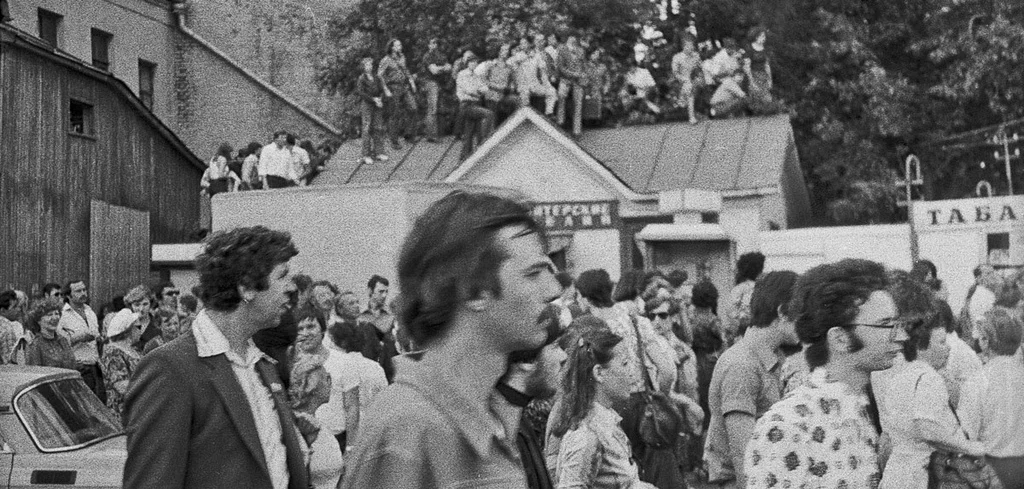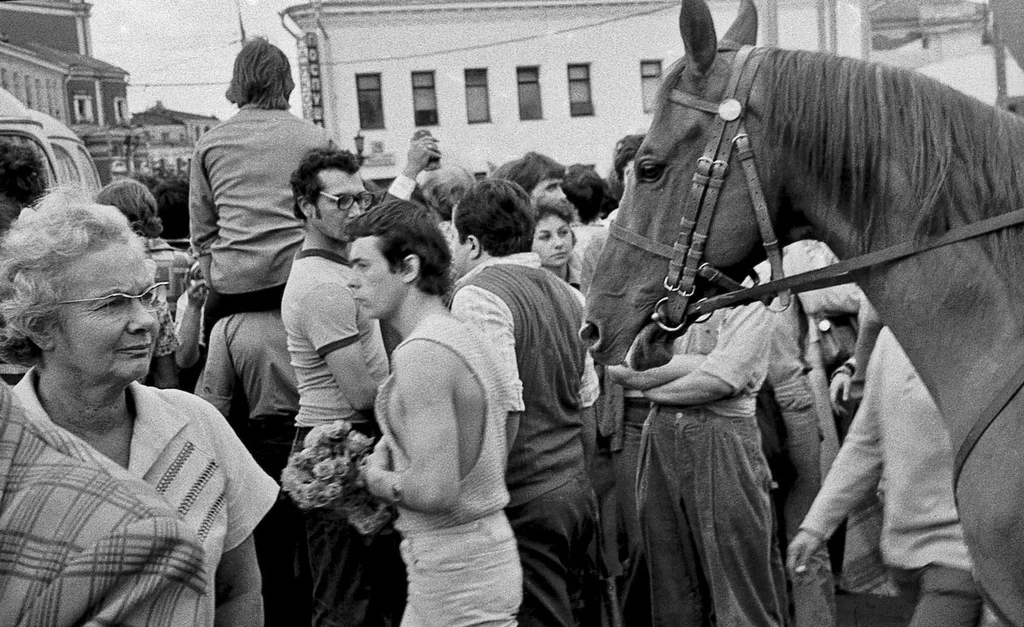 А происходило интересное, по советским меркам. Во-первых, народ, почувствовав свободу, залезал на все, что было возможно. Начиная с плеч товарища, затем на деревья, на киоски, на крыши домов... Милиция, конечно, их сгоняла, но так как народу было намного больше, все высокие места пустовали недолго. На помощь пешей милиции приехали конные милиционеры. Они, конечно, по заборам не прыгали, но зато равномерно распределились в толпе и, незаметно подергивая узды своих скакунов, заставляли их шарахаться из стороны в сторону, что приводило к разрежению кучности толпы на площади.