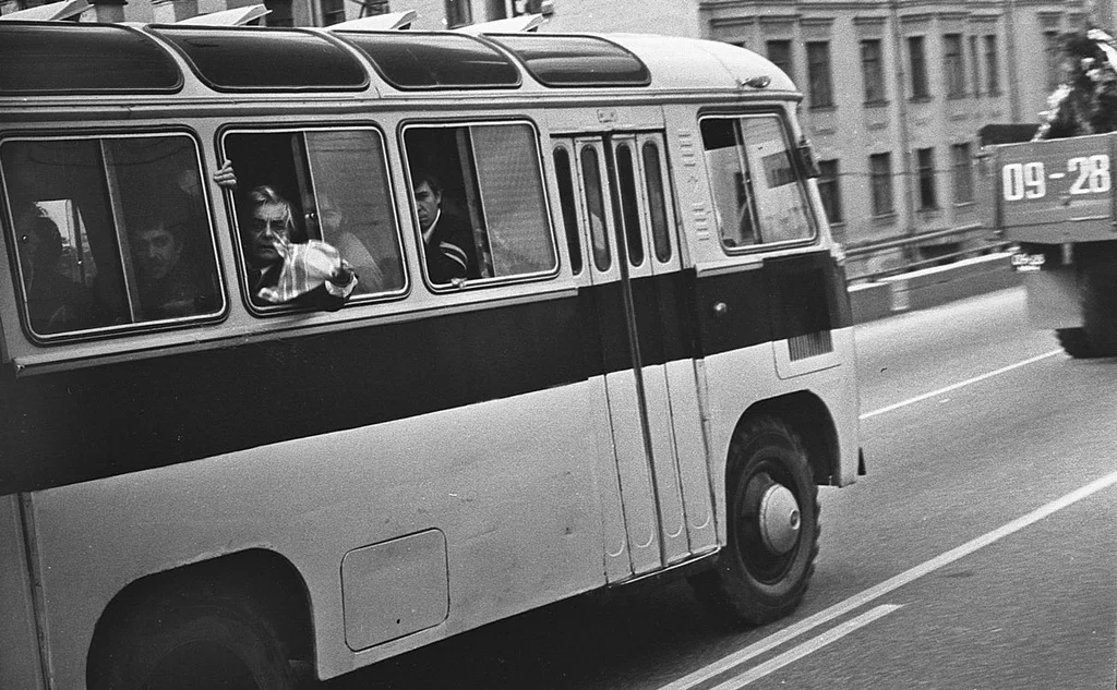 Автобус с труппой театра на Таганке направляется на Ваганьковское кладбище.