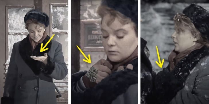 Татьяна выходит из школы без рукавиц, менее чем за секунду, пока камера меняет план, она «успевает» надеть перчатки, ну а через несколько минут актриса и вовсе оказывается в черных варежках.