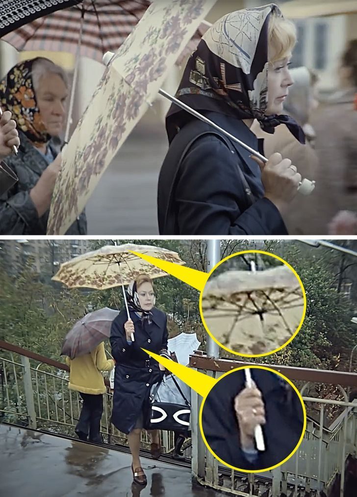 В сцене, где героиня Ирины Муравьевой убирает листву, за телефонной будкой виден мужчина, который трясет дерево, чтобы листья падали активнее.