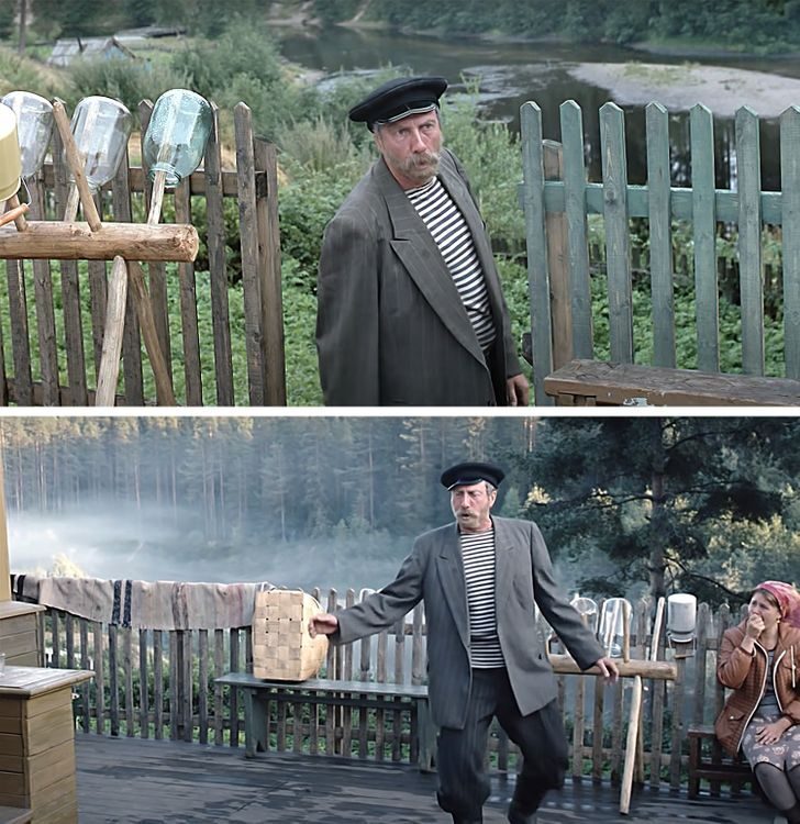 В сцене, когда Дядя Митя приходит навещать ''лапшу'' Наде про то как у Бабы Шуры случился инфаркт миокарда, ,,ВОТ ТАКОЙ РУБЕЦ'' ,на картине мы видим что над рекой нет тумана, а потом он резко появляется после смены плана.