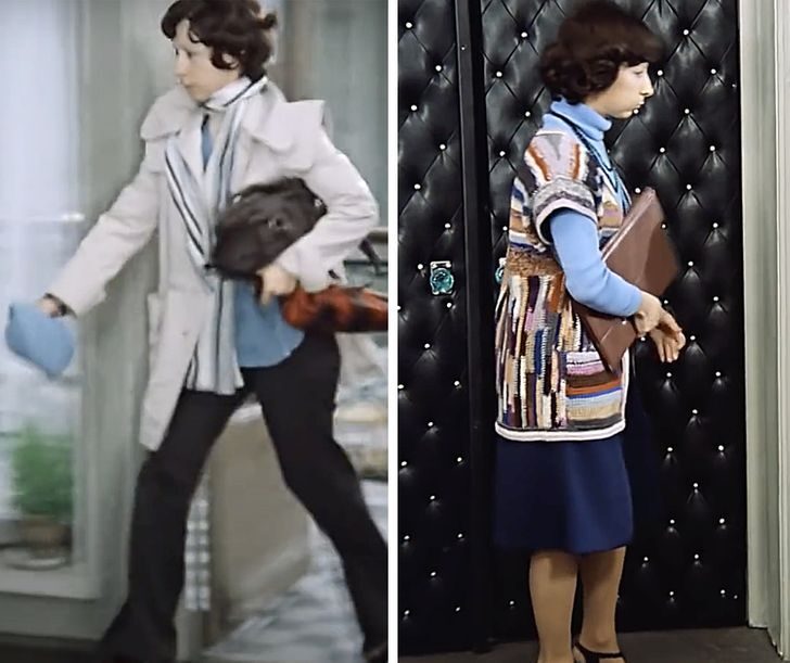 Секретарша Верочка приходит на работу в черных брюках, в следующей сцене мы видим на ней синюю юбку.