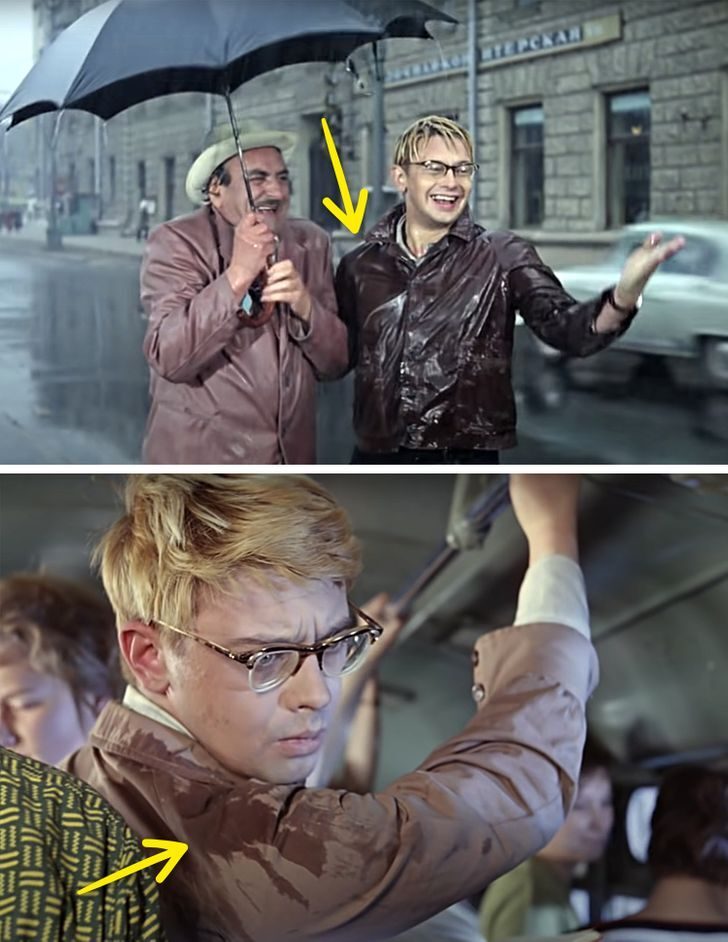 В одном из эпизодов Шурик попадает под сильный дождь. На кадре четко видно, что одежда его вся промокла.