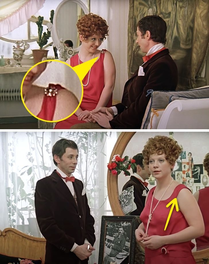 Брошка с левого плечика платья Зинули то исчезает, то появляется на прежнем месте. Обратите внимание и на бусы героини, которые загадочным образом меняются в этой сцене.
