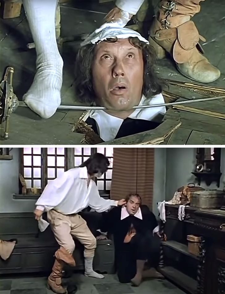 В сцене, где д’Артаньян бреет голову бедняге, который пришел за Констанцией, сапог у него надет на левую ногу, однако когда он спускается вниз, обувь оказывается уже на правой.